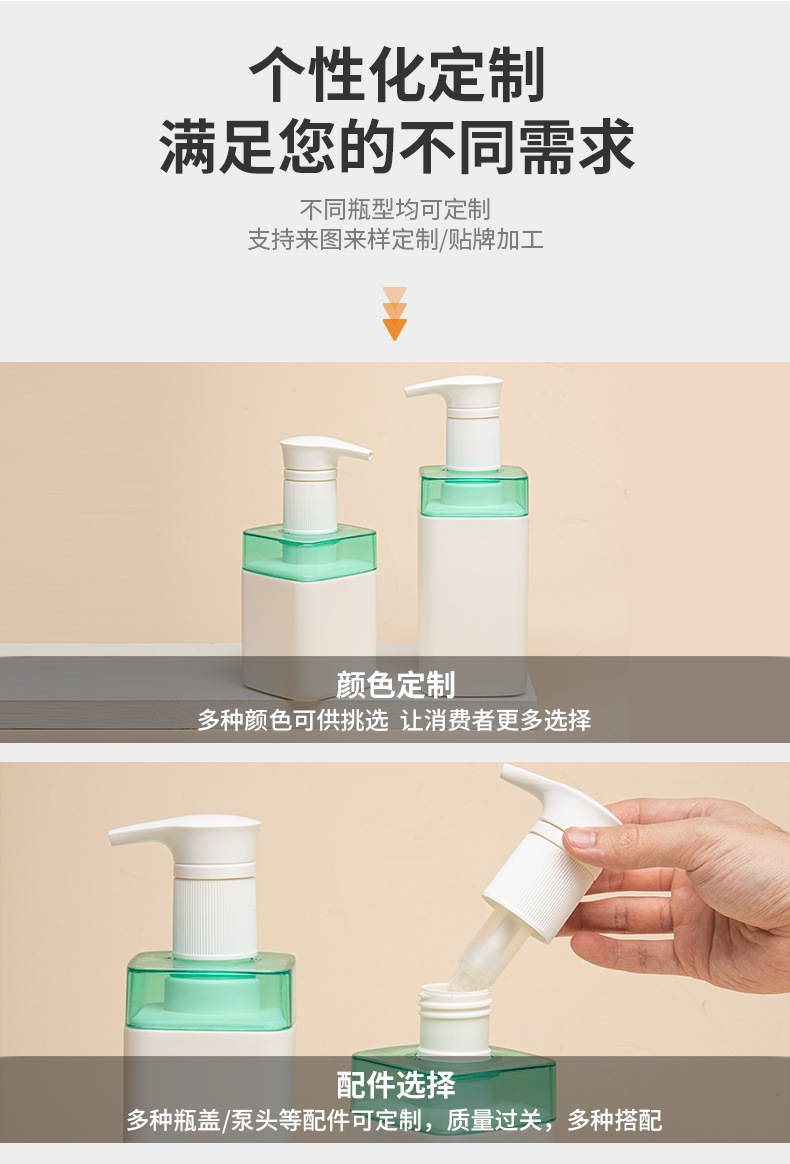 • 現(xiàn)貨PE撞色洗護(hù)瓶包材300ml乳液瓶500ml洗發(fā)水瓶800ml沐浴露瓶子,適用洗發(fā)水、沐浴露、護(hù)發(fā)素、身體乳、洗衣液等。
