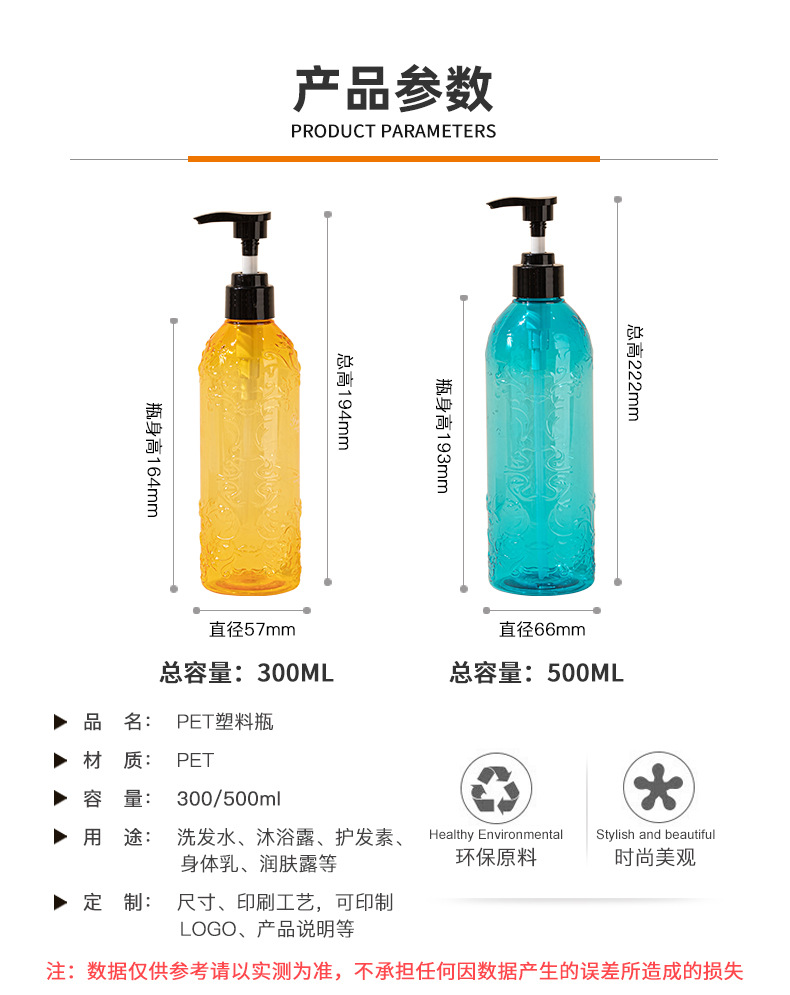 • 現(xiàn)貨PET洗發(fā)水瓶300ml/500ml爽膚水沐浴露瓶子高端洗護(hù)瓶洗發(fā)露瓶,適用洗發(fā)水、沐浴露、護(hù)發(fā)素、身體乳、洗衣液等。