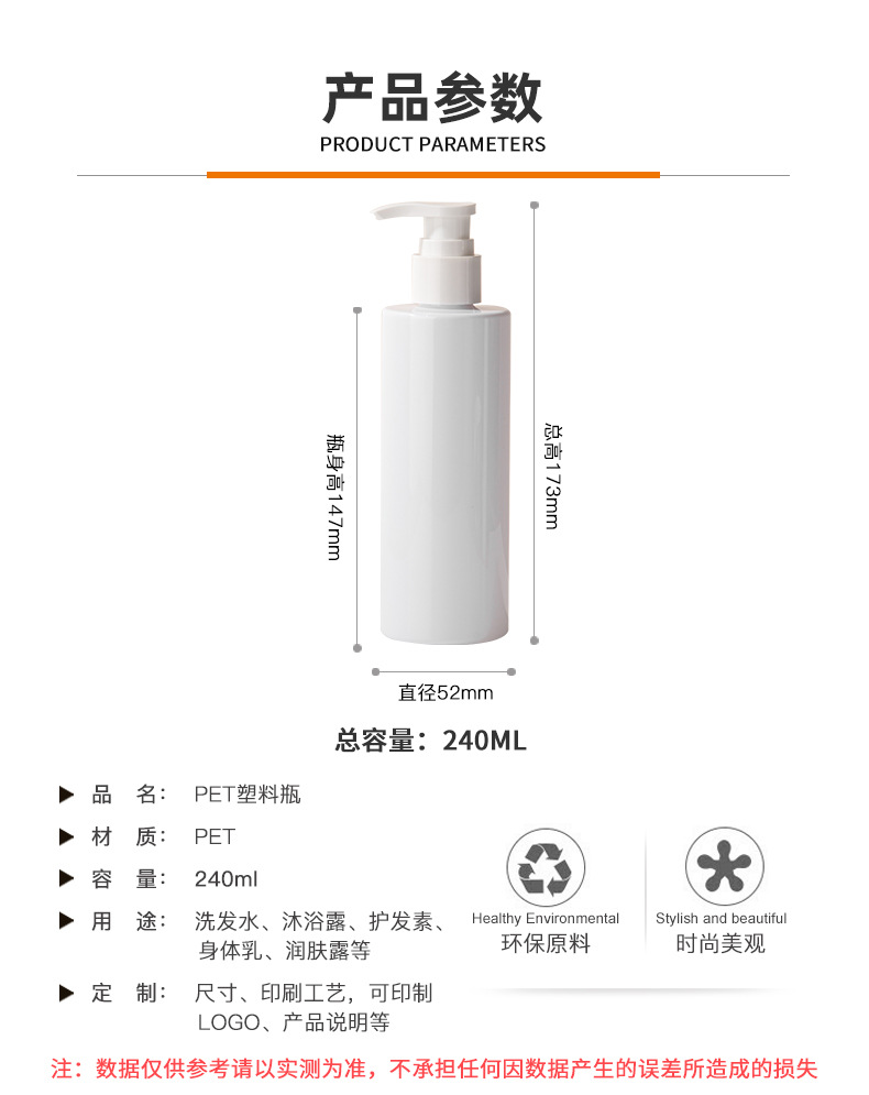 • pet塑料平肩白色圓瓶洗護(hù)包材240ml洗發(fā)水沐浴露瓶按壓乳液瓶,適用洗發(fā)水、沐浴露、護(hù)發(fā)素、身體乳、洗衣液等。
